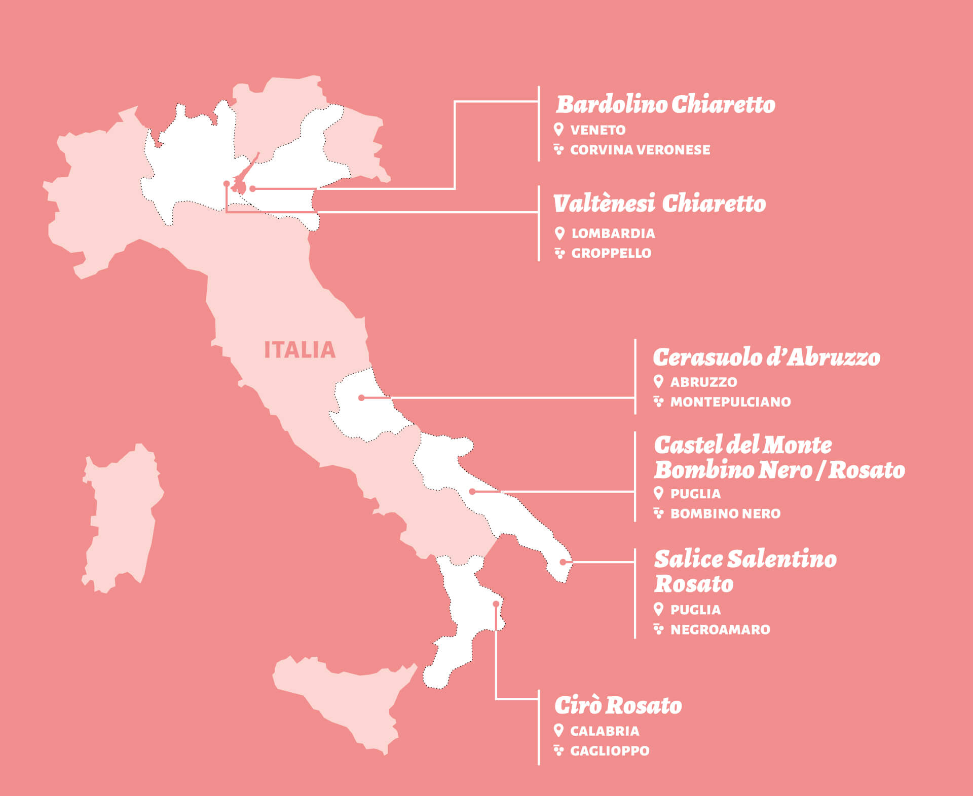 Sous le nom de Rosautoctono, 6 appellations italiennes ont créé une structure commune pour la promotion de leurs rosés – il s’agit du Cirò (Calabre), du Salice Salentino (Pouilles), du Castel del Monte (Pouilles également), du Cerasuolo d’Abruzzo (Abruzzes), du Bardolino Chiaretto (Vénétie) et du Valtènesi Chiaretto (Lombardie).